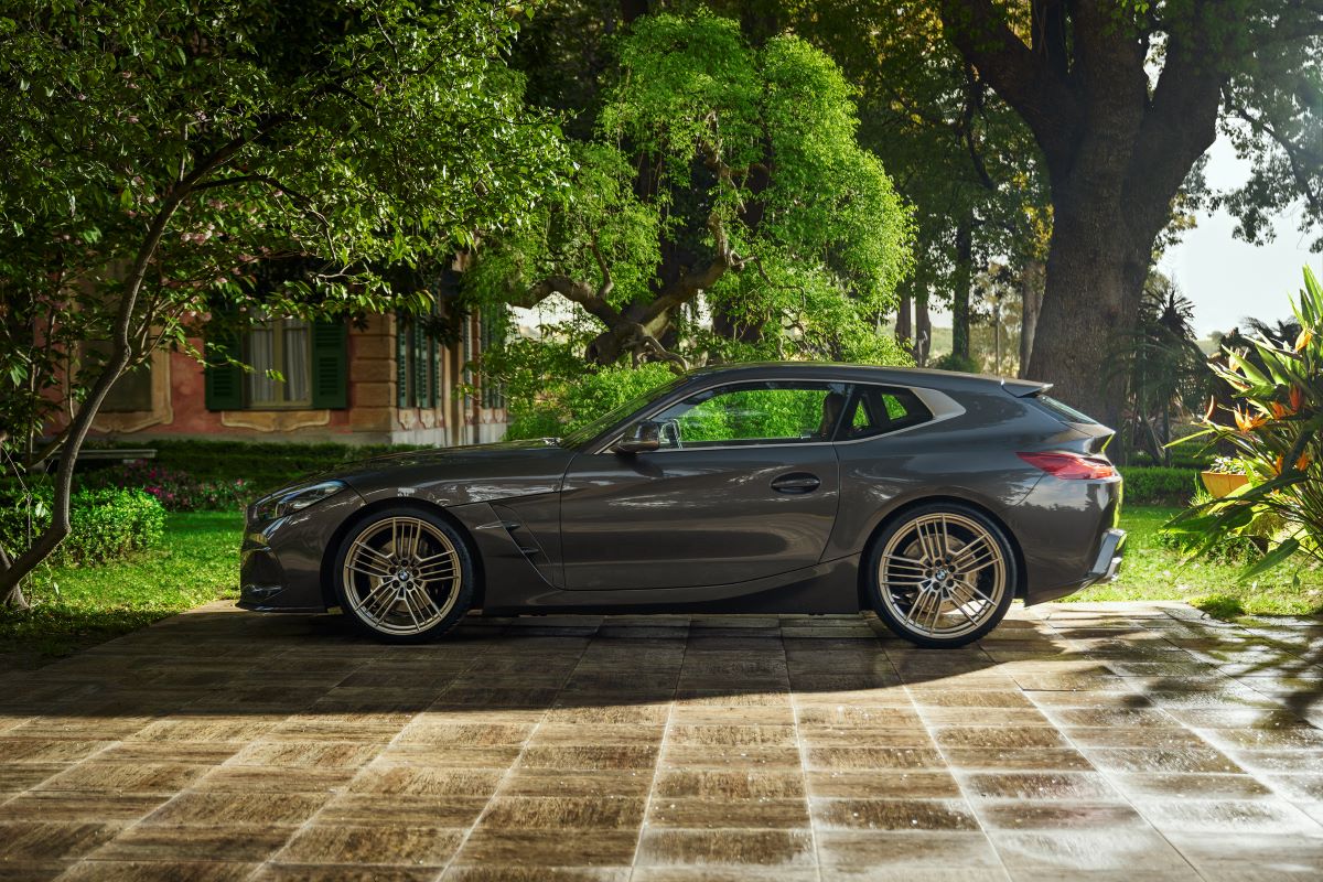 Visto desde un lado, la interpretación típica de BMW de las proporciones del freno de tiro es claramente reconocible. El capó largo, los contornos aerodinámicos del techo y la poderosa sección trasera forman un diseño distintivo de dos cajas, mientras que el gráfico de la ventana lateral alargada con el Hofmeister kink y los pasos de rueda traseros ensanchados subrayan su elegancia deportiva.